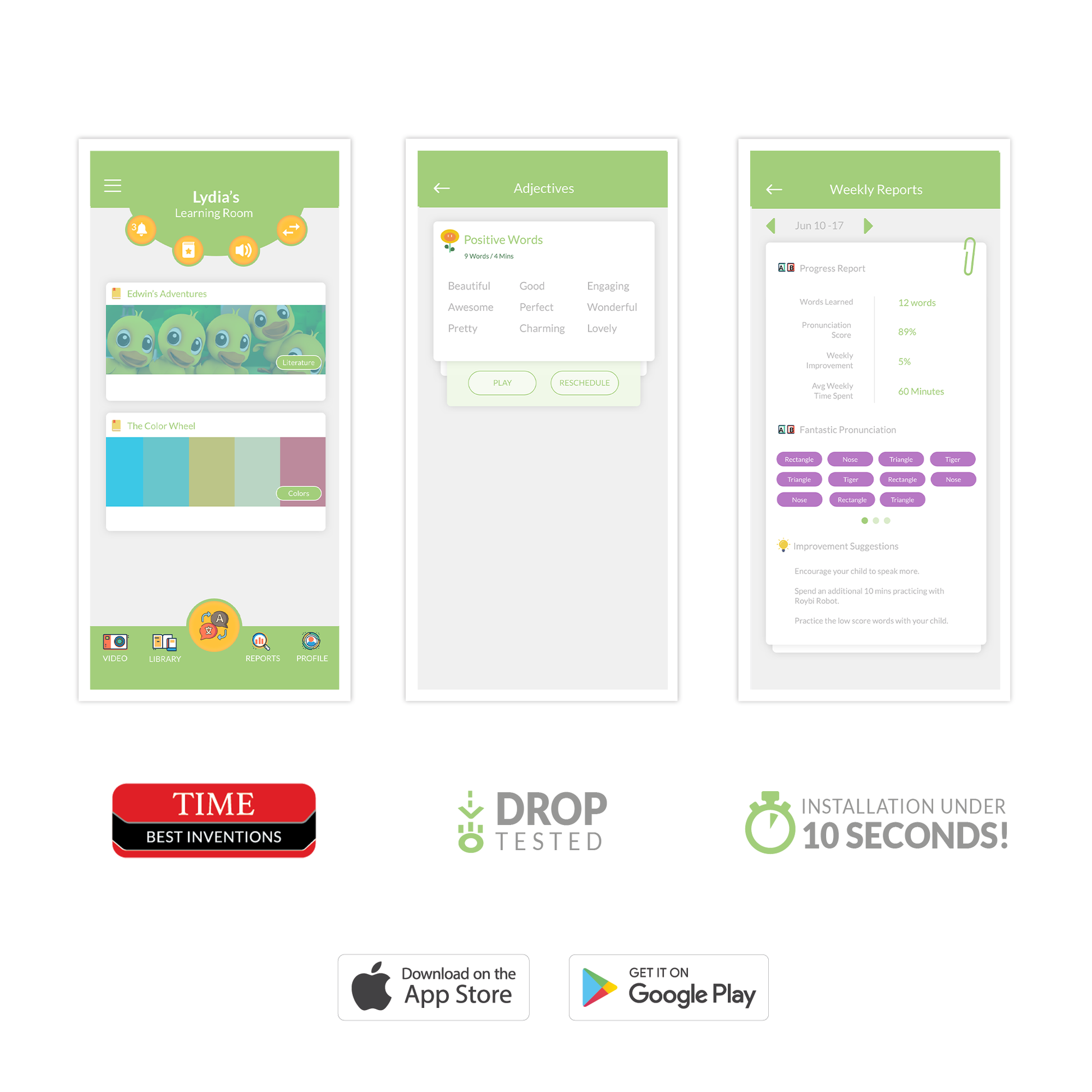 APP & REPORT - Schedule, Manage, and Track your child¡¯s lessons & progress throughout their educational journey. Use our free iOS or Android app for full content control and detailed progress reports including pronunciation scores.